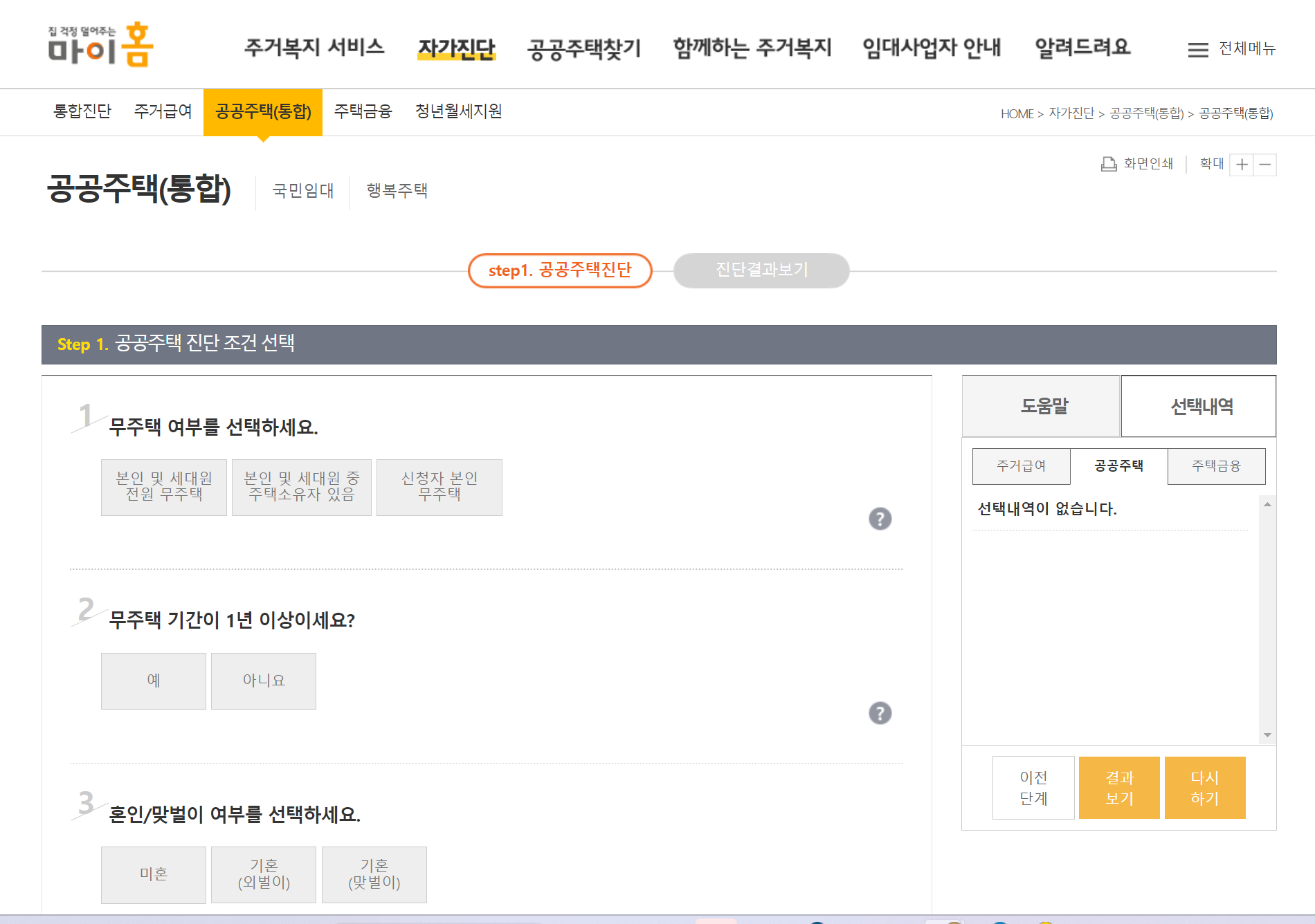 내가 무주택자라면 공공임대주택에 입주할 수 있는지 모의로 진단해 볼 수 있습니다. 마이홈 포털 사이트에서는 자가진단을 운영하여 공공주택 종류 중 어떤 곳에서 살 수 있을지 신청하기 전 모의로 자가진단 해볼 수 있습니다.