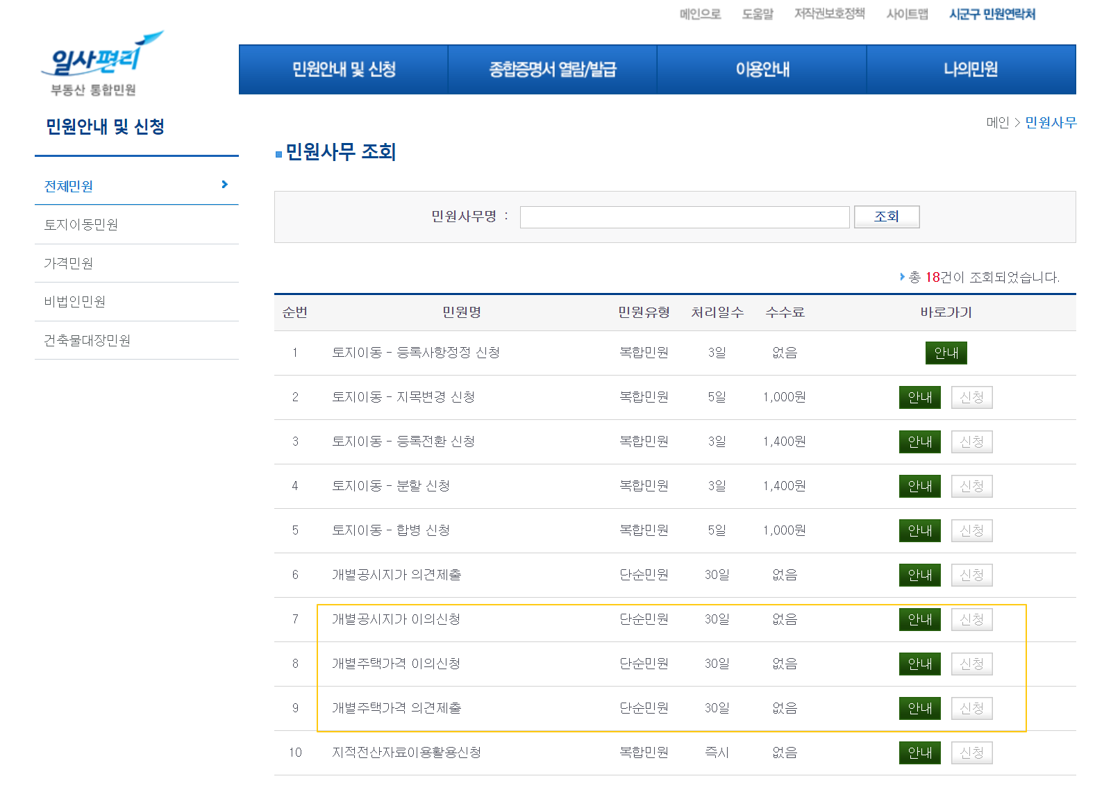 위 버튼 클릭 시 부동산 통합민원 일사편리 사이트로 이동되는데요, 카테고리 중 민원안내 및 신청 영역 클릭하면 민원사무 조회라는 페이지로 이동할 수 있습니다.