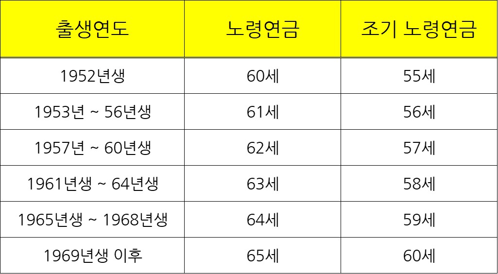 위 표와 같이 출생연도에 따라 달라지며 개인의 경제 상황이나 건강 상황에 따라 수급 시기를 빠르게 조정할 수 있습니다.