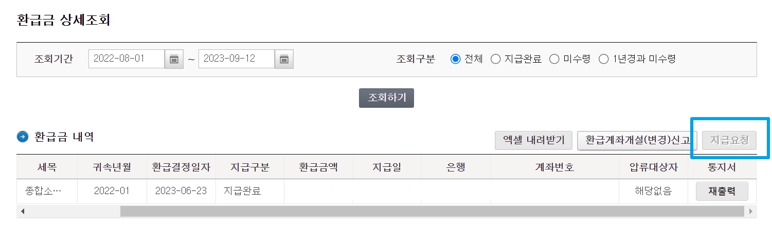 저희 경우는 활성화 되지 않았는데요, 만약 환급받아야할 내용이 있는 분들은 지급 요청을 통해 환급 계좌를 개설하고 신고 버튼을 눌러줍니다.