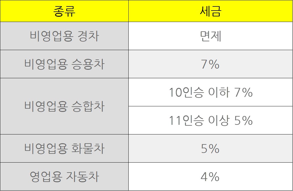 아래 표를 참고하시어 차량 목적에 따른 세율을 확인해보시기 바랍니다.