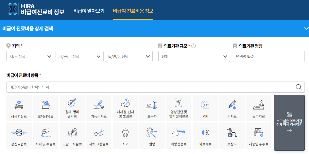 해당 홈페이지에서 현재 살고 있는 [지역] 그리고 [의료기관 규모]를 선택 후 비급여 진료비 항목에 [대상포진]을 입력해줍니다.
