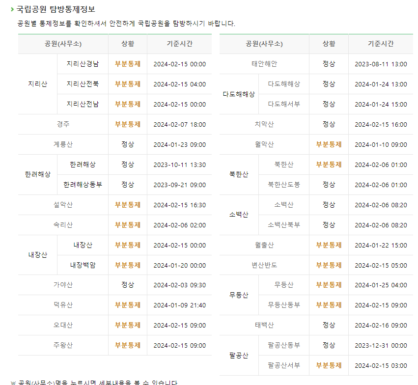 대다수의 국립공원이 정상적으로 방문할수도있으나 부분통제로 작성되어있는 경우에는 꼭 확인 후 어떤 구간을 오를 수 없는지 확인해보셔야 합니다.
