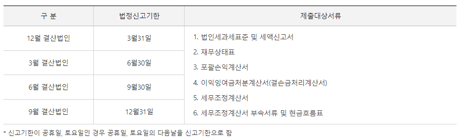 보통 법인 사업장의 경우 분기별로 결산법인을 진행하고 있는데요 이 기간에 따라 법정 신고기한이 정해져 있습니다. 아래 법인세 신고시 언제까지 신고를 진행해야하는지 체크 후 기간 내 납부하시길 바라겠습니다.