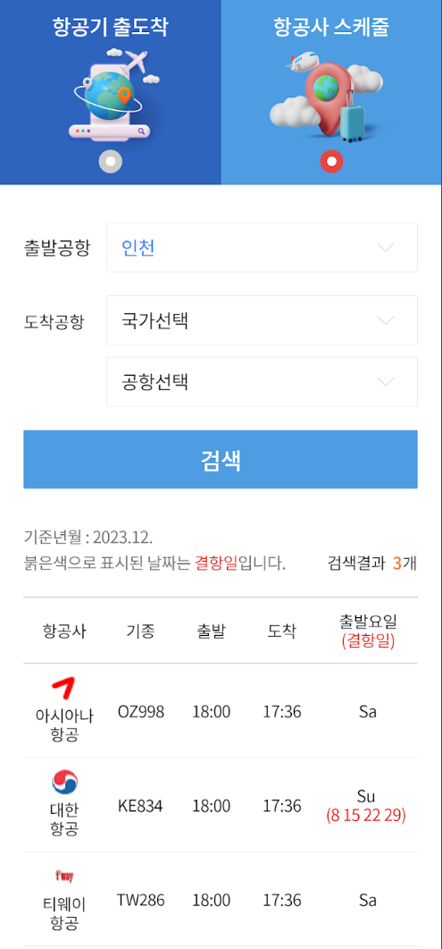 해당 앱을 통해 모든 항공시 운항 스케쥴 뿐 아니라 출발과 도착 시간까지 확인해볼 수 있습니다.