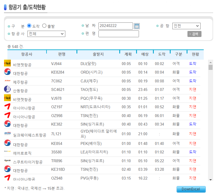 이 처럼 항공기 출발과 도착 현황을 한 눈에 조회해볼 수 있는 페이지로 이동되는데요, 먼저 날짜를 오늘로 해둔 다음 도착했으면 도착이라고 현황이 되어있고, 15분 가량 이상 초과하여 도착하는 경우에는 지연으로 표기 됩니다.