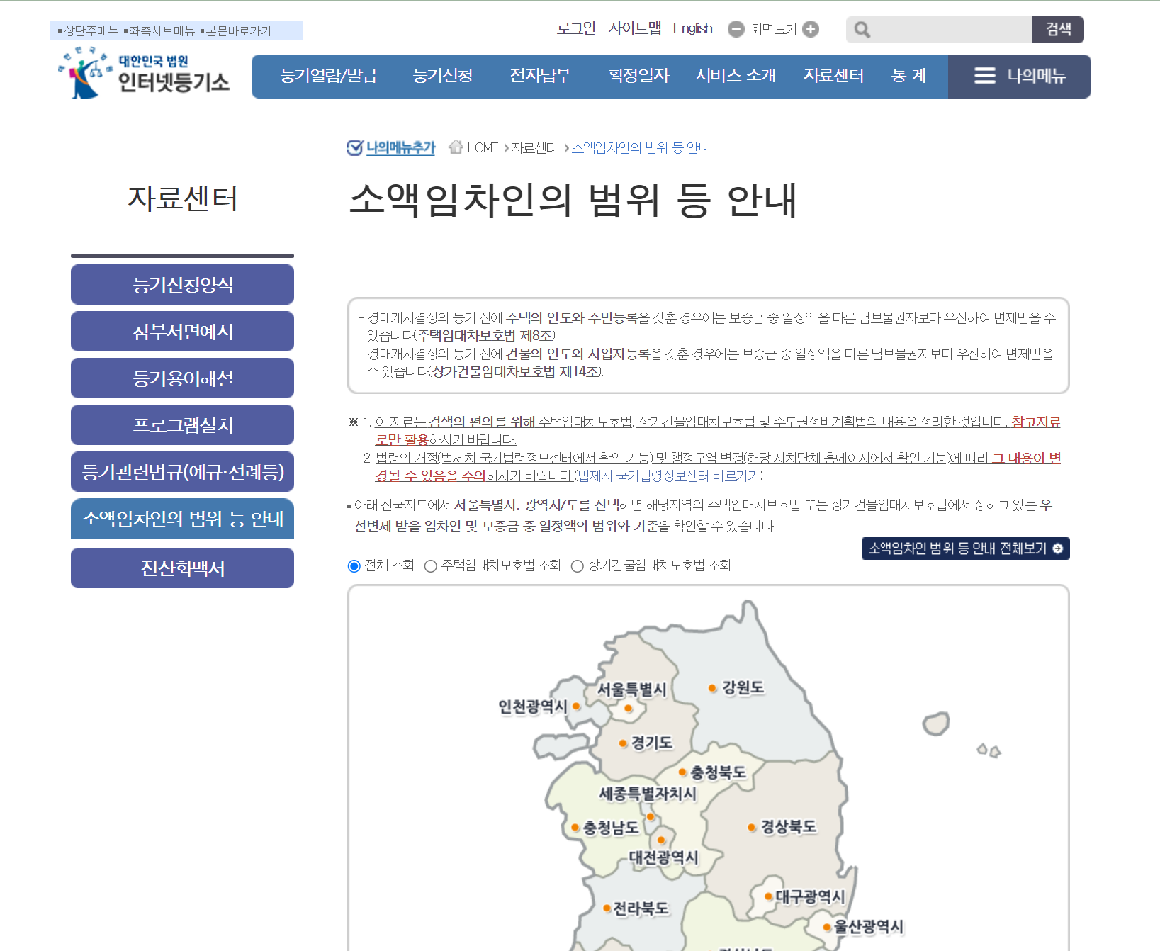소액임차인의 범위는 인터넷등기소에서 확인할 수 있습니다. 해당 사이트 내 전국 지도를 통해 해당 지역에서의 임대차 보호법과 일정액, 그리고 범위 기준 등을 직접 확인해 볼 수 있습니다.