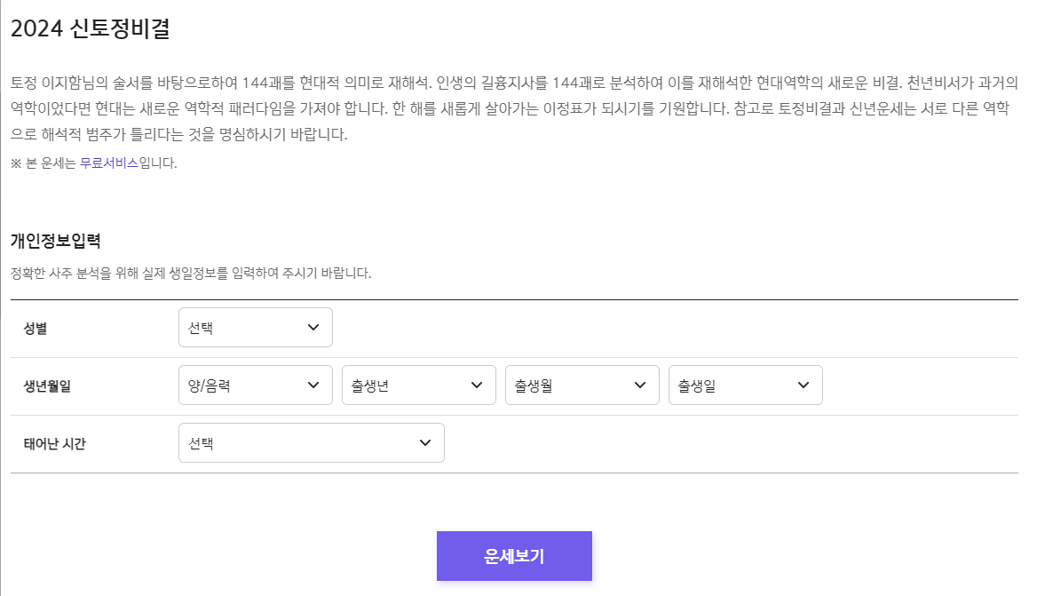 해당 사이트 역시 토정비결을 무료로 확인할수 있는데요, 현재 2024년 신년운세가 오픈되면서 많은 사람들의 인기를 끌고 있는 사이트 입니다.