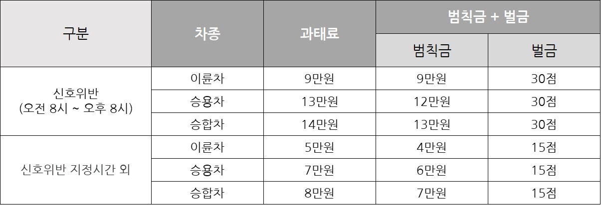 신호위반 과태료 & 범칙금 벌금 및 벌점