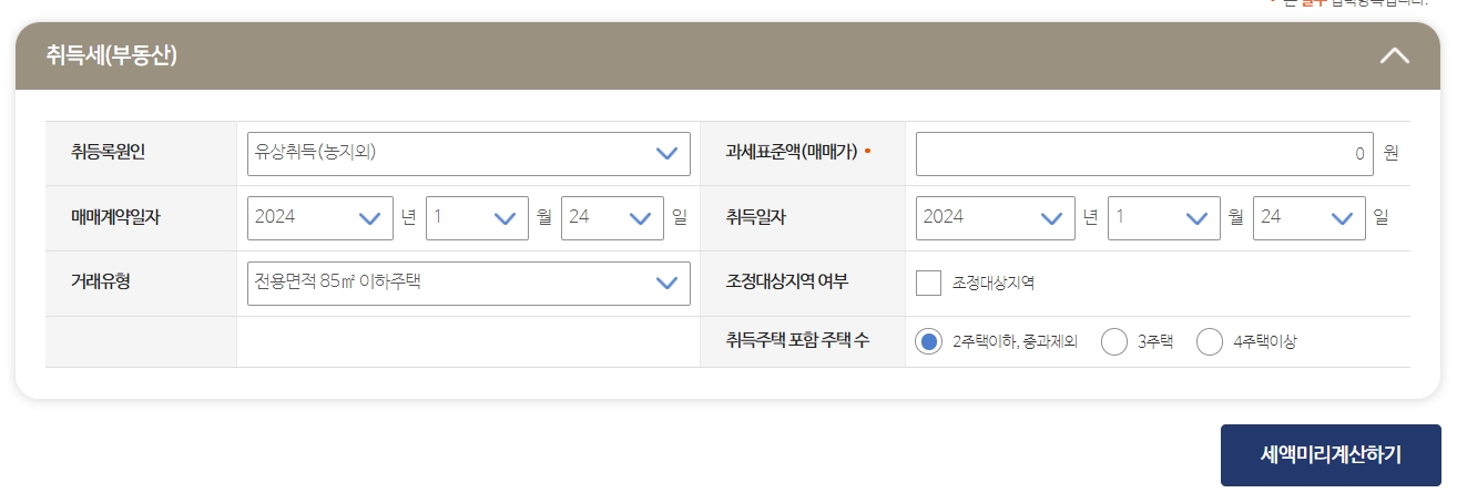 아파트의 경우 취등록 원인을 유상취득(농지외)로 두시면 됩니다. 그리고 매매가, 취득일자, 매매 계약일자, 거래유형, 조정대상지역 등 내 조건에 맞는 영역을 입력하시고 세액 미리 계산하기를 클릭해주시기 바랍니다.