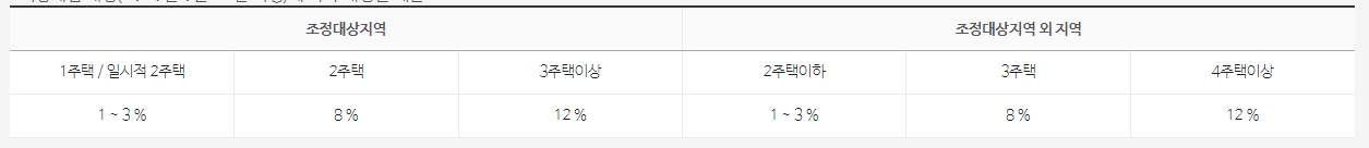 이 처럼 일시적 2주택과 1주택이신 분들은 3% 미만의 세율이 곱해지지만 주택이 2개, 3개 이상이신 분들은 좀 더 많은 세율이 매겨지게 됩니다. 이는 실제 거주하는 것이 아닌 투 자용으로 아파트를 매매하는 것을 지양하기 때문입니다.
