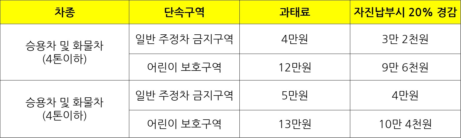 다만 어린이보호구역 스쿨존의 경우 2~3배가 올라갑니다. 아래 표를 참고하시어 과태료를 확인해보시기 바랍니다.