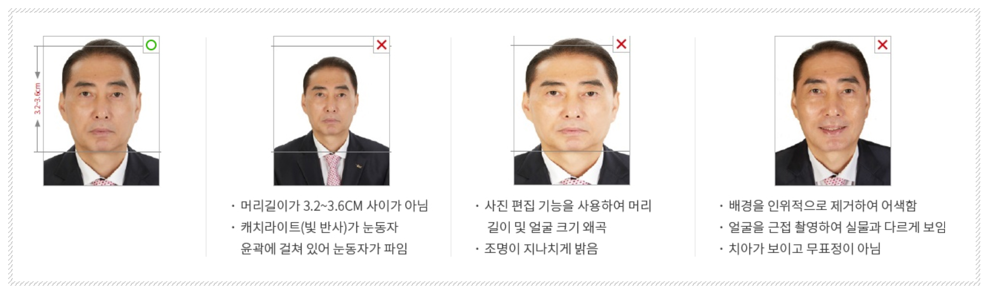 여권 사진 사이즈는 3.5 X 4.5 cm이며 머리 길이의 경우 머리카락을 제외 한 머리 최상부부터 턱까지의 길이가 3.2 ~ 3.6cm 사이여야 합니다.,