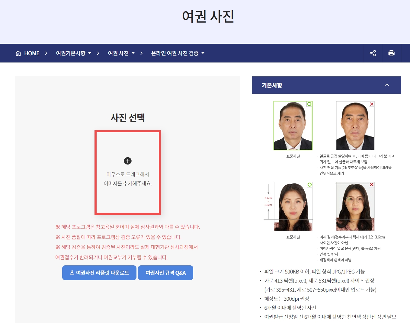 마우스를 드래그해서 이미지를추가해 여권 사진을 검증하는 시스템이기때문에 꼭 PC에서만 가능한 점 참고해주시기 바랍니다. 모바일로 들어가면 PC로 진행하라는 안내가 나옵니다.