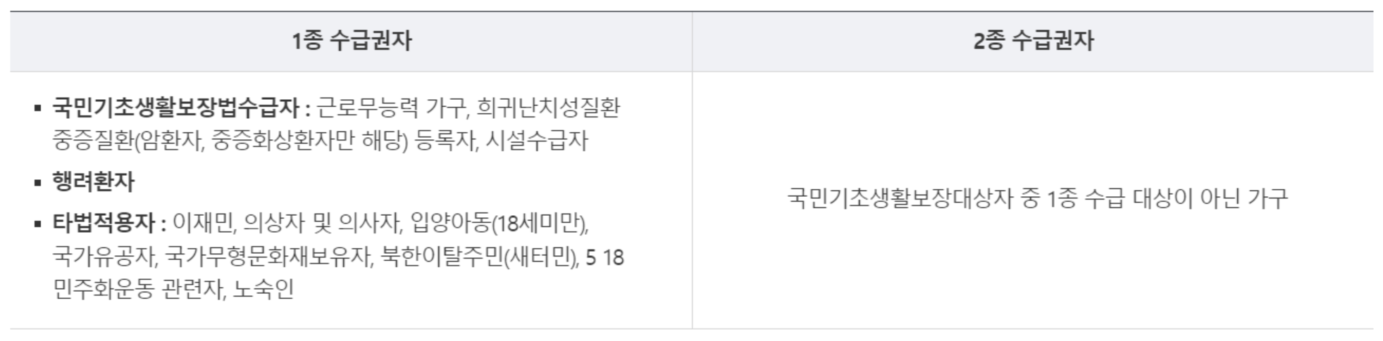 또한 정부에서 지정한 이재민, 의사자, 의사자의 유족, 국가유공자 그리고 그 유족 등도 1종에 해당됩니다.