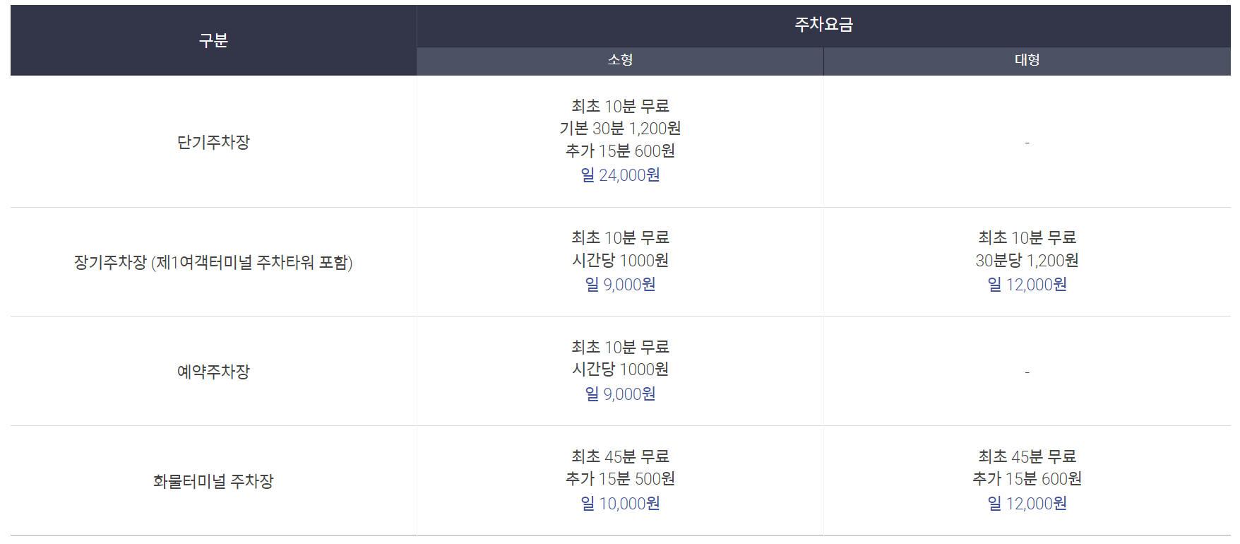장기 주차 요금은 단기 주차 요금보다 저렴한 것을 확인할 수 있는데요, 단기주차를 하루동안 이용할 경우 일 24,000원 그리고 장기주차장에 하루동안 이용시 일9천원의 요금이 소요됩니다.