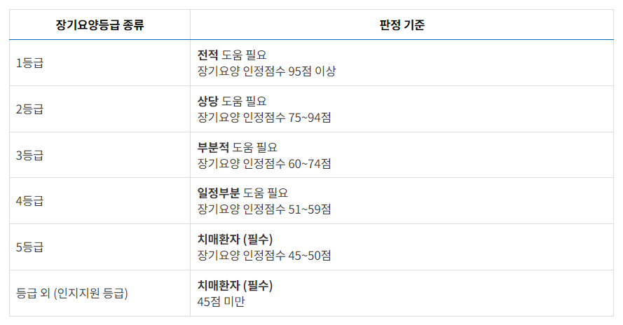 따라서 요양원 시설에 입소하기 위해서는 1등급과 2등급이 되어야 하며, 3등급부터 5등급까지는 시설에 입소하기가 어렵습니다.