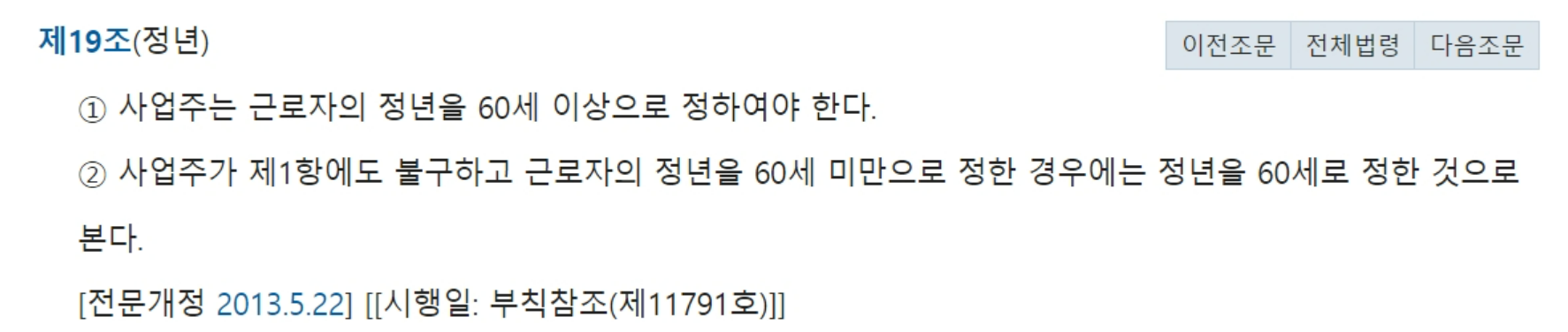 보통 만 60세이지만 대학교수라던가 행정직 공무원 등 만 65세까지 정년을 채우기도 합니다. 아래는 근로기준법에 나와있는 정년 나이가 고지된 내용입니다.
