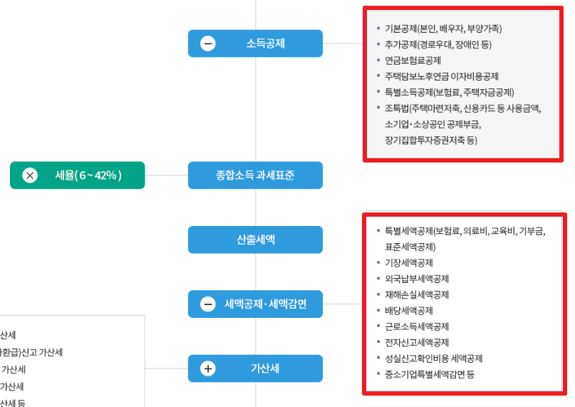 세율을 곱하기 전 소득공제를 통해 기본공제와 추가 공제 등 공제되는 부분에 대한 항목을 먼저 제외시켜줍니다.