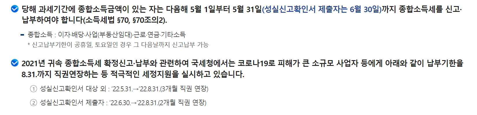 만약 2022 1월 1일부터 12월 31일에 벌어들인 소득이 있다면, 2023년 5월 1일부터 31일까지 한 달가량 종합소득세 신고를 해야합니다.