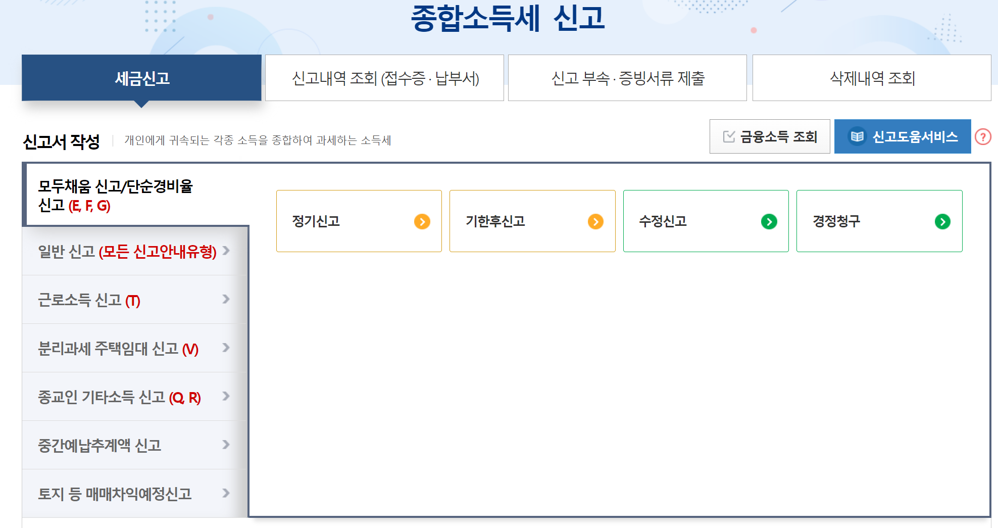 페이지 이동시 '정기신고' 버튼을 클릭하시면 되고 만약 기한이 지났을 경우 기한 후 신고를 눌러주시면 됩니다.