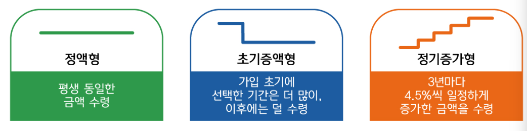 연금의 성격을 갖고있기 때문인데요 지급을 어떤식으로 받느냐에 따라 정액형, 초기증액형, 정기증가형 등으로 선택할 수 있는 것 입니다.