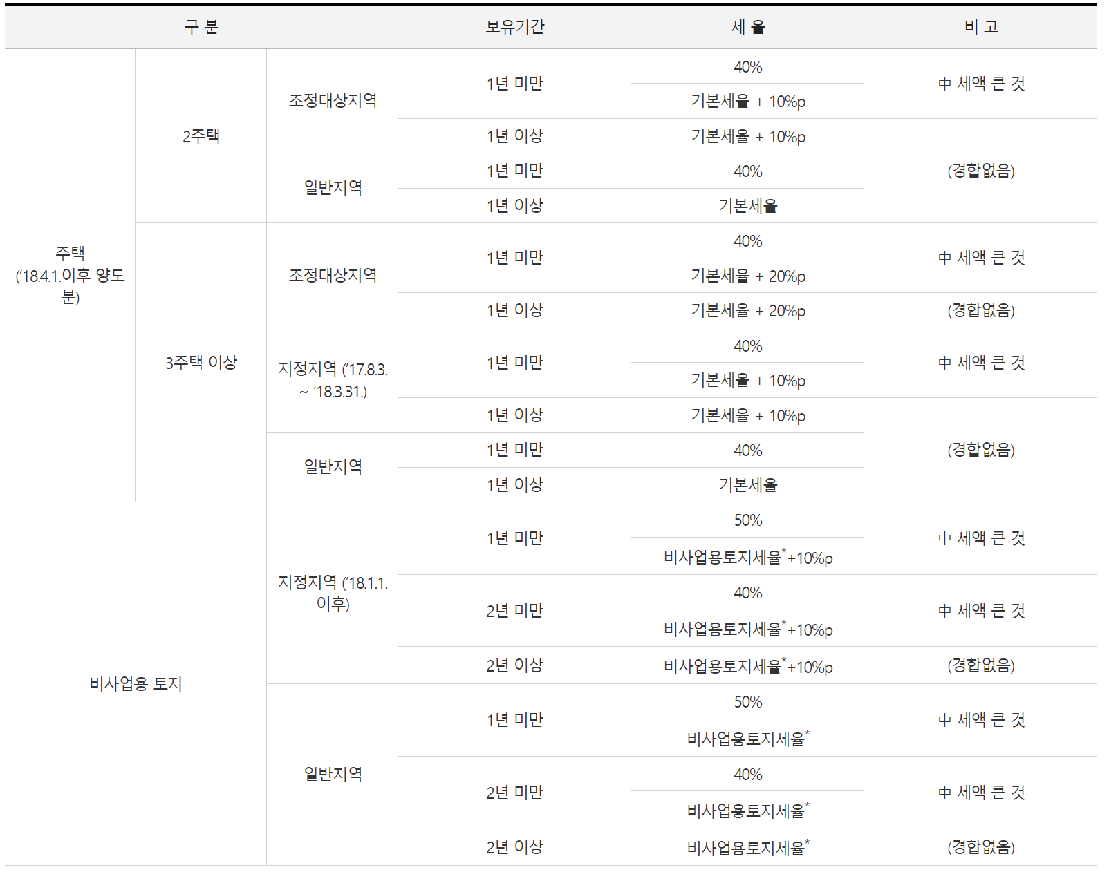 아래는 기본세율로써 만약 1 가구 1 주택인 경우 기본 양도소득세율 표를 참고하시면 됩니다.