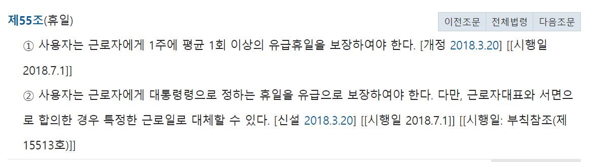 해당 주휴수당에 대한 내용은 근로기준법 제55조에도 나와있는 내용인데요, 1주일에 평균 1회 이상의 유급 휴일을 보장해야 한다고 나와있습니다.