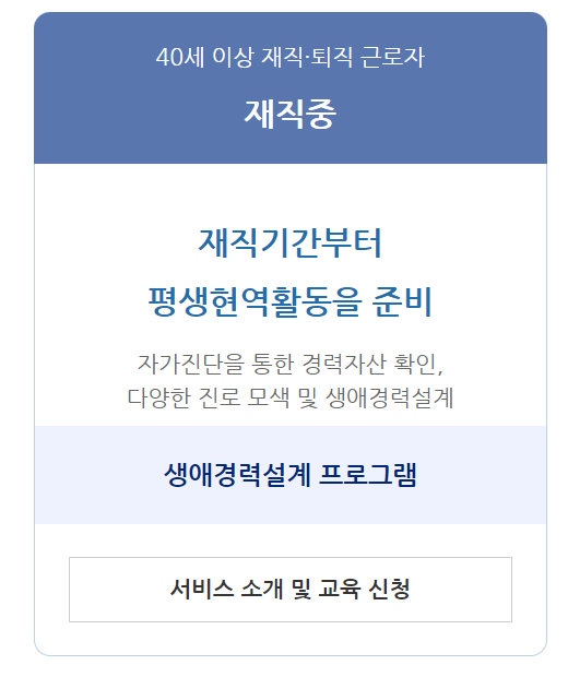 40세 이상의 재직 및 퇴직 근로자의 경우 재직기간부터 평생 현역 활동을 준비하는 것을 도와줍니다. 경력 자산을 확인하고 다양한 지로 등을 모색할 수 있도록 생애 경력 설계 프로그램 활용하게 됩니다.