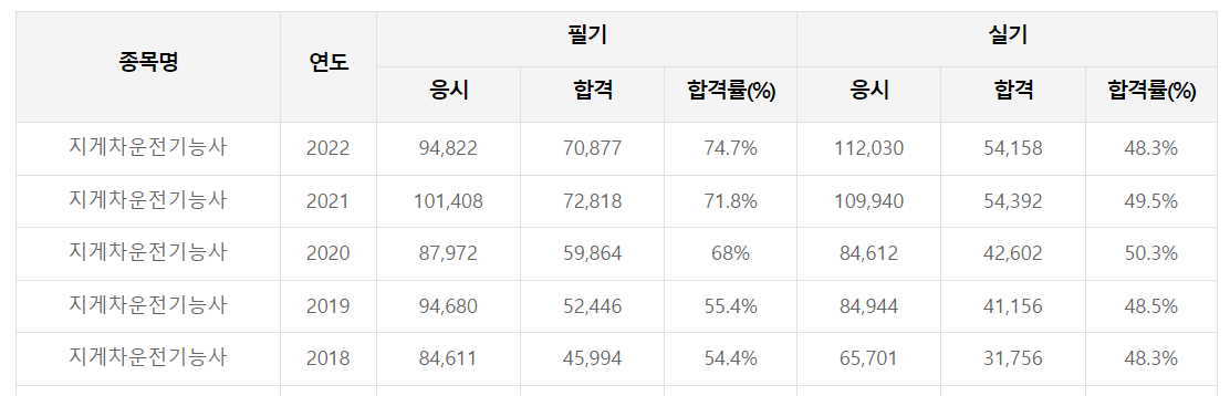 사실 지게차 운전기능사는 전문적인 기능을 요하기 때문에 합격률이 높진 않습니다. 그럼에도 불구하고 필기시험의 경우는 70%의 합격률을 보이는데요 실기의 경우 50% 가량의 합격률로 꽤 어렵다고 할 수 있습니다.