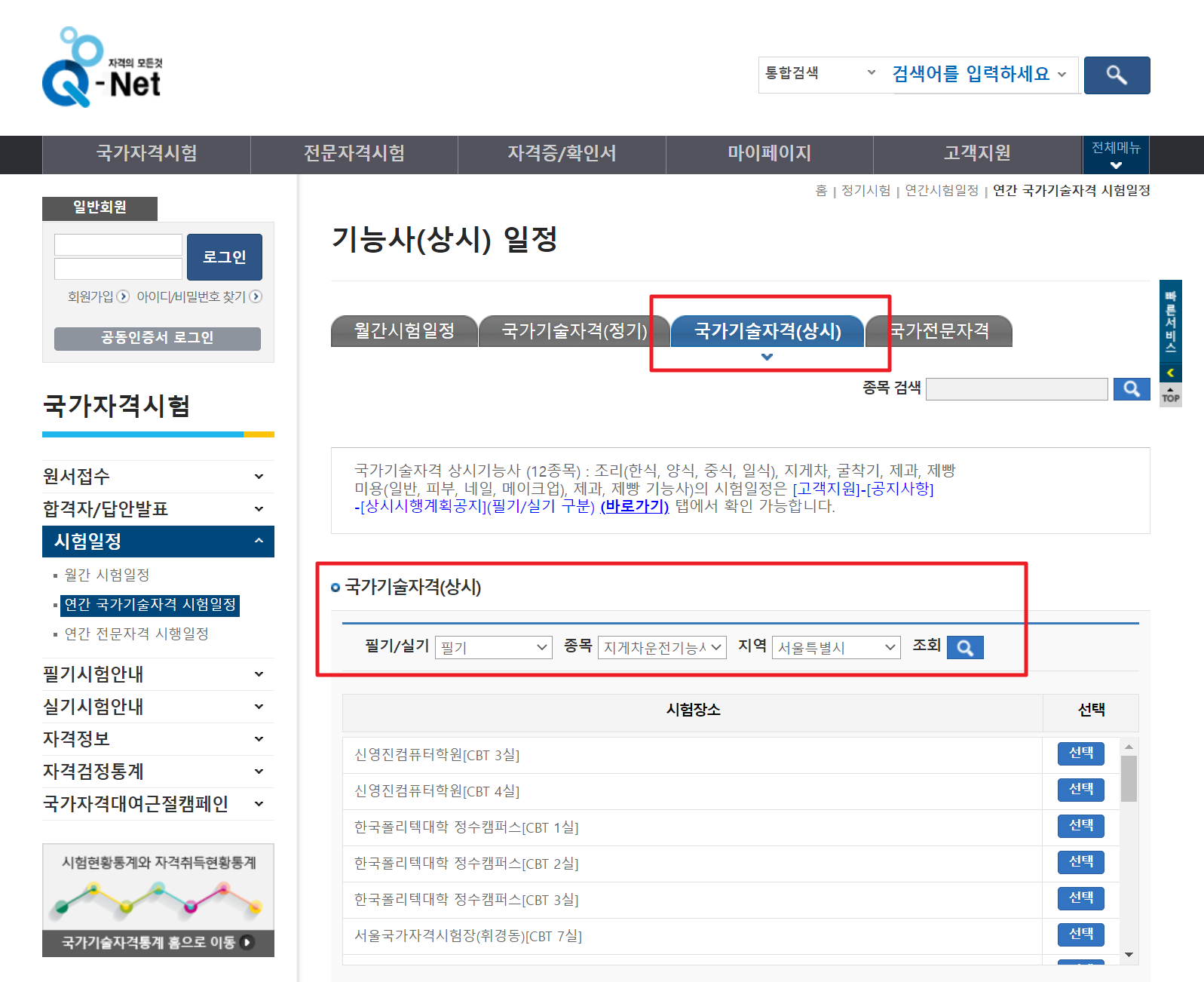 Q-net 홈페이지 메인 페이지에서 국가자격시험 > 시험 일정 > 연간 국가기술자격시험일정 클릭 후 내가 살고 있는 지역 근처에서 진행되는 시험에 응시하시면 됩니다.