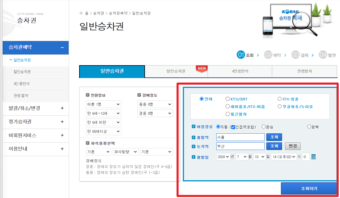 현장에서도 예매가 가능하지만 코레일 홈페이지를 통해 우리는 온라인, 또는 모바일을 통해 예매할 수 있습니다. 위 버튼을 클릭하시면 아래와 같은 일반승차권 예매 페이지로 이동되는데요,