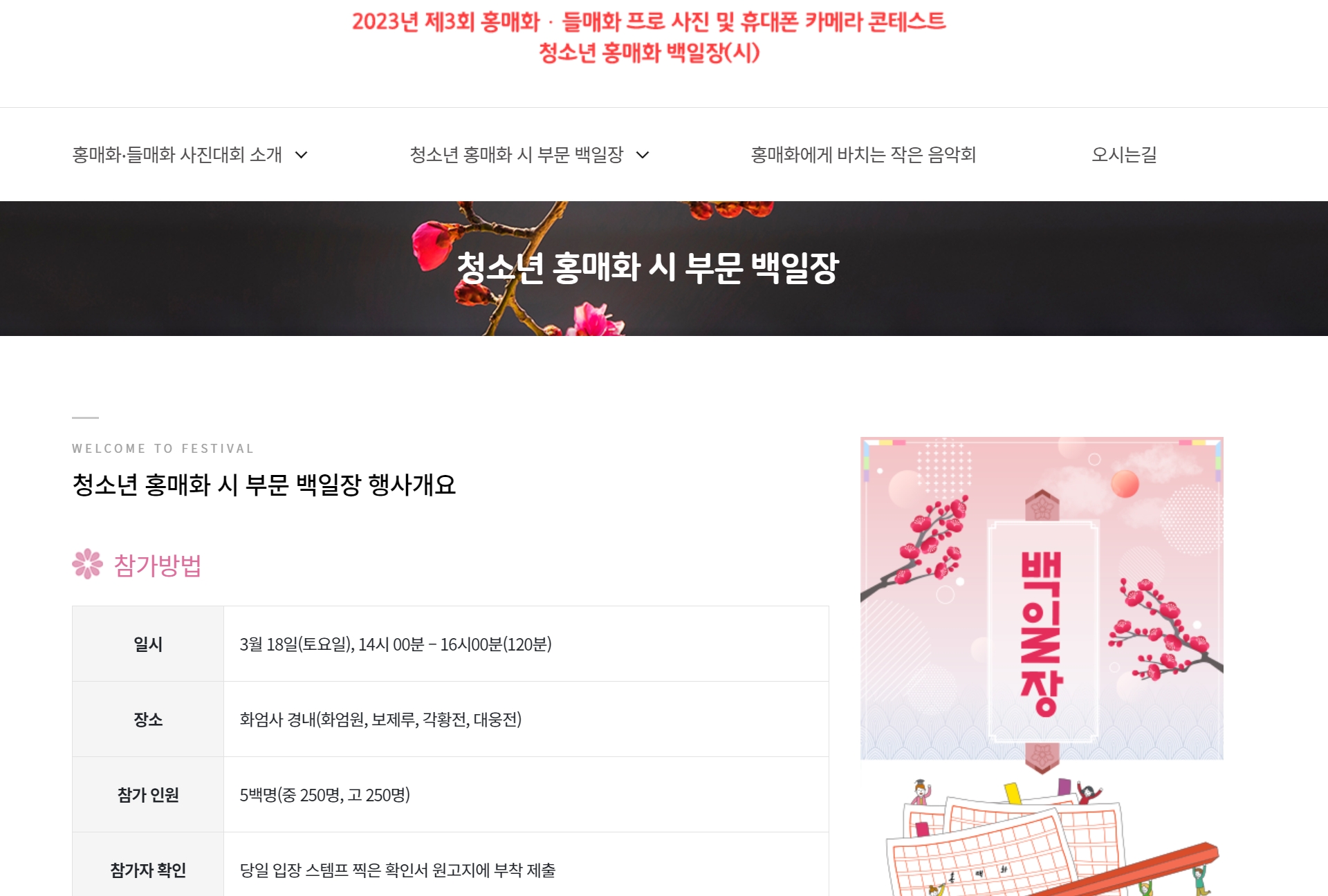 홍매화가 피는 절은 또 있습니다. 바로 화엄사 인데요, 화엄사에서는 축제처럼 백일장이 열리기도 합니다. 카메라 콘테스트뿐만 아니라 백일장과 음악회도 준비되어 있다고 합니다.