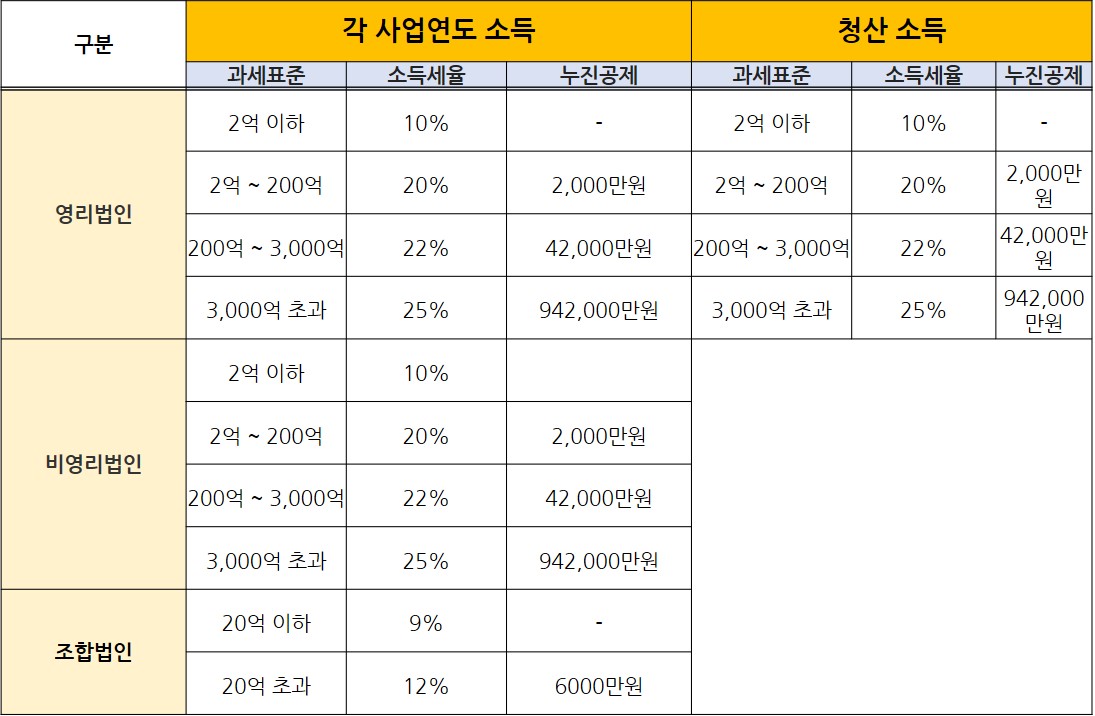 개인사업자 소득세율 및 법인사업자의 소득세율을 모두 확인해 보실 수 있도록 표로 준비했습니다.