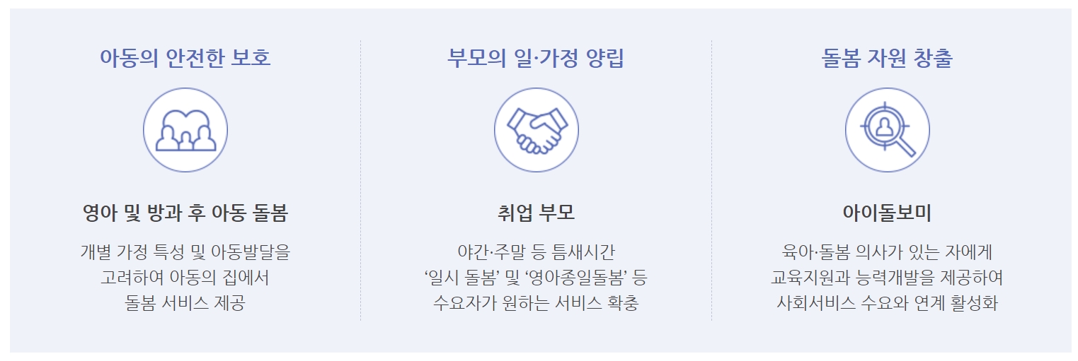 - 시간제 아이 돌봄 : 임시 보육, 놀이 활동, 보육 시설이나 초등학교 등하원 동행, 간식이나 준비된 식사 챙겨주기 등