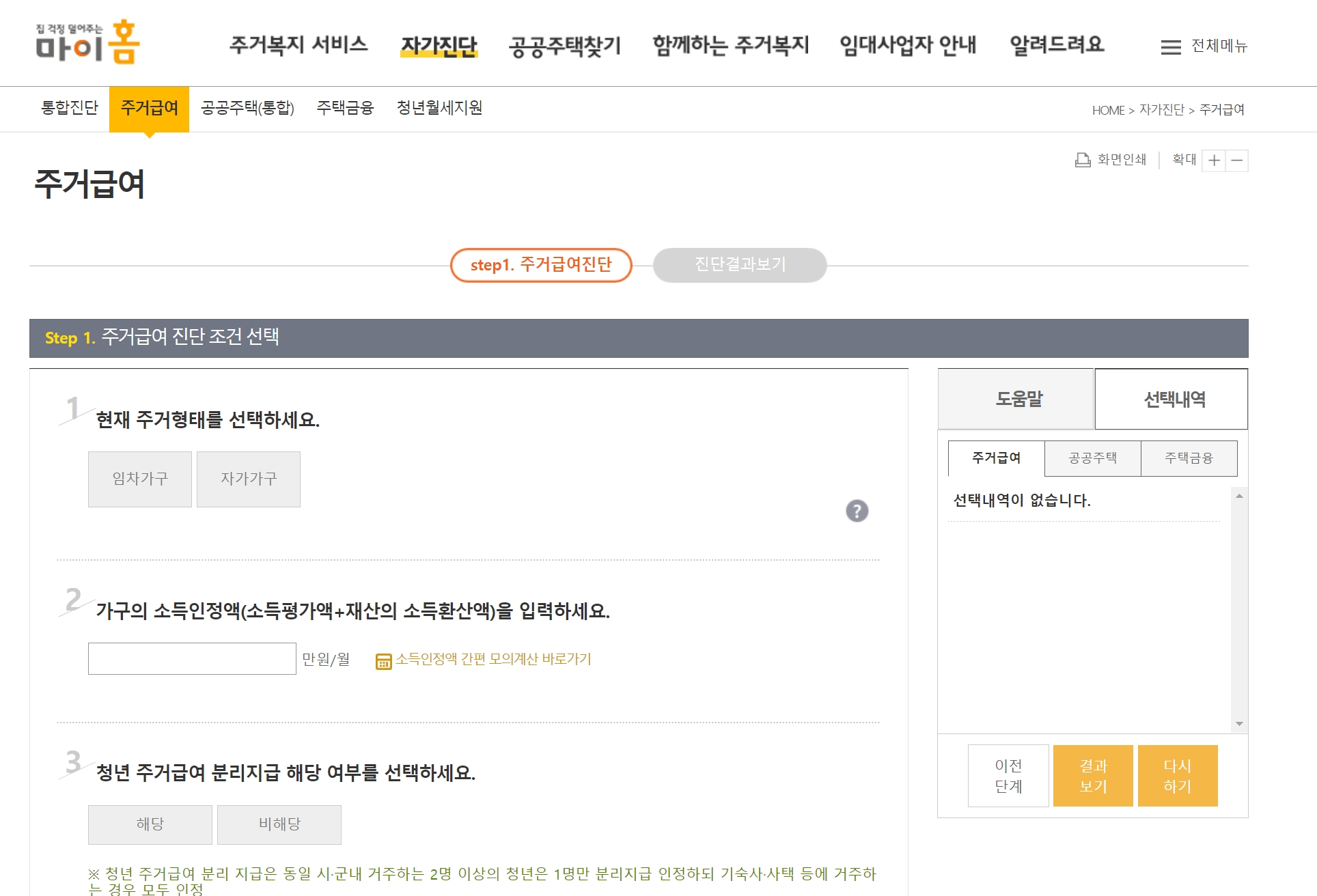 주거급여를 받을 수 있는지 헷갈리시는 분들은 마이홈 페이지를 통해 자가진단을 진행해 보실 수 있습니다. 주거 형태를 선택하고 월급 등을 입력하여 쉽게 알아보도록 합니다. 링크를 연결해 놓을 테니 바로 이동해 보시기 바랍니다.