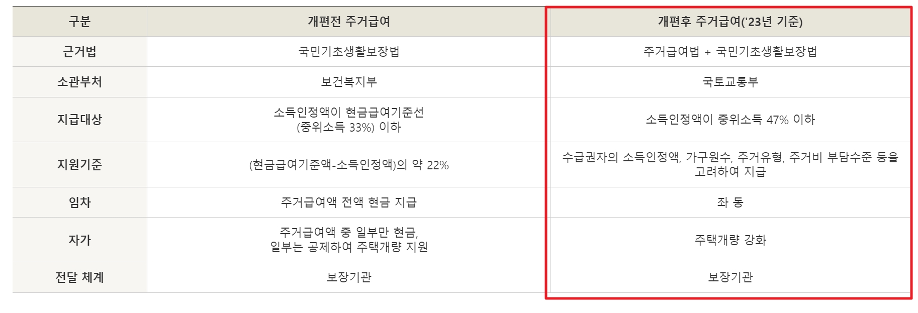 2023년 개편된 주거급여 내용은 위 표를 확인해 보시기 바랍니다. 소관부처가 국토교통부로 변경되었으며 지원 기준 또한 소득의 22%로 지정되는 것이 아니라 주거비 수준이 고려되어 선정됩니다.