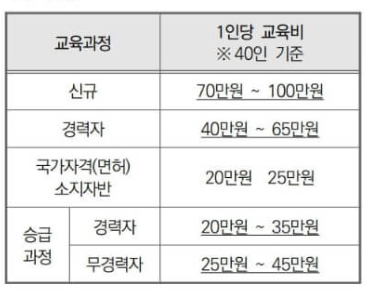전체적으로 수강료도 오를 것 이라는 전망입니다. 교육과정에 따른 교육비는 신규자와 경력자에 따라 구분되는데요 아래와 같이 교육비를 확인해볼 수 있습니다.
